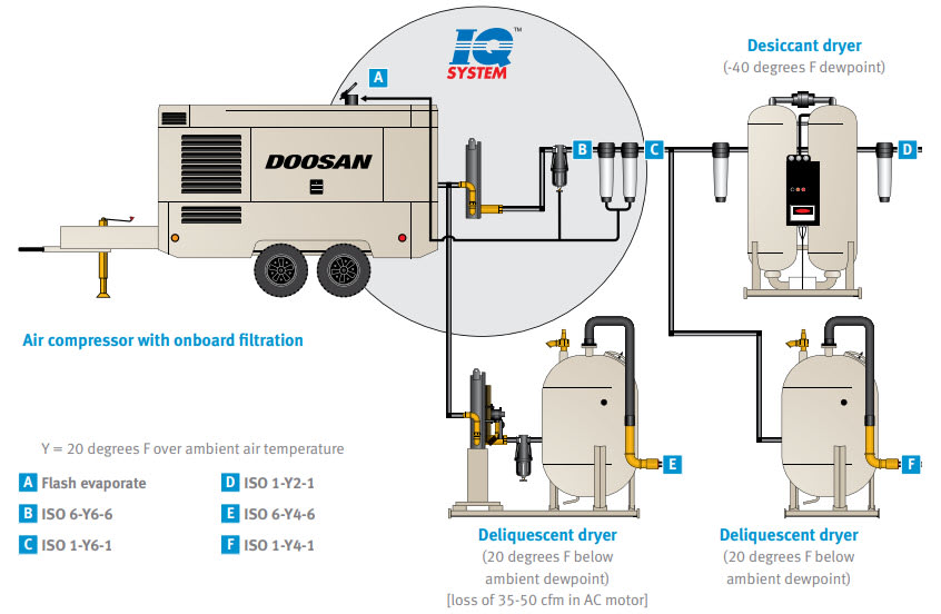 El aire limpio es esencial para la seguridad y la eficacia de innumerables aplicaciones de aire comprimido. Sin él, los contaminantes tan dañinos como el aceite, el polvo, la suciedad y el agua pueden atacar al sistema y provocar tiempos de inactividad, daños en los instrumentos e incluso responsabilidad por el producto. Su mejor defensa contra estos contaminantes es Doosan Portable Power. Ofrecemos los sistemas de aire limpio (compresores, posrefrigeradores y secadores) que le permiten cumplir con precisión las normas ISO de su sector. Nuestro enfoque modular le permite a usted y a su distribuidor de Doosan Portable Power desarrollar una solución de aire limpio personalizada.